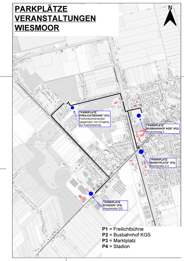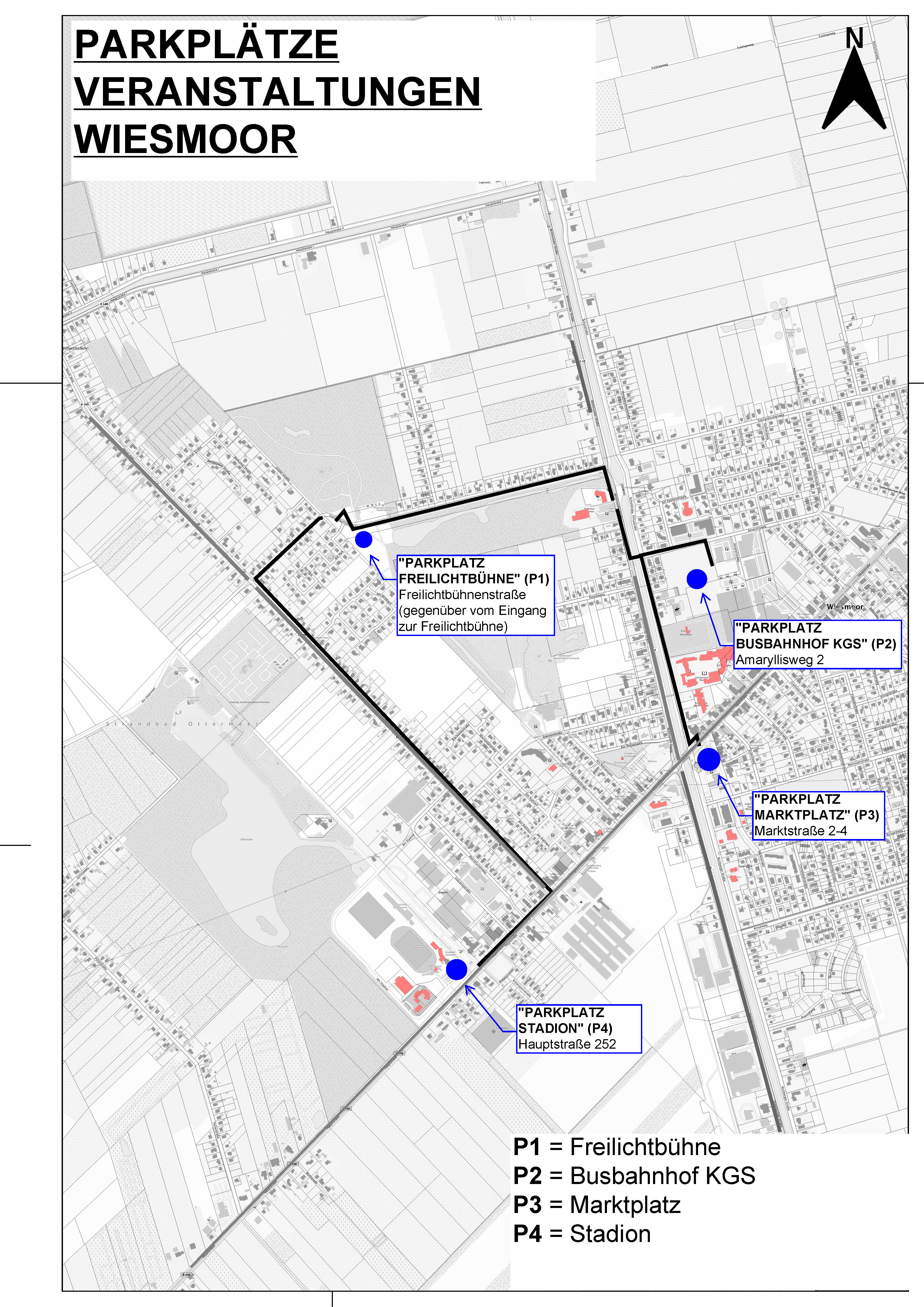 Parkmöglichkeiten sind neben den begrenzten Flächen an und neben der Blumenhalle, vor allem bei der Freilichtbühne, beim Busbahnhof der KGS und am Marktplatz zu finden (siehe Park-Plan).