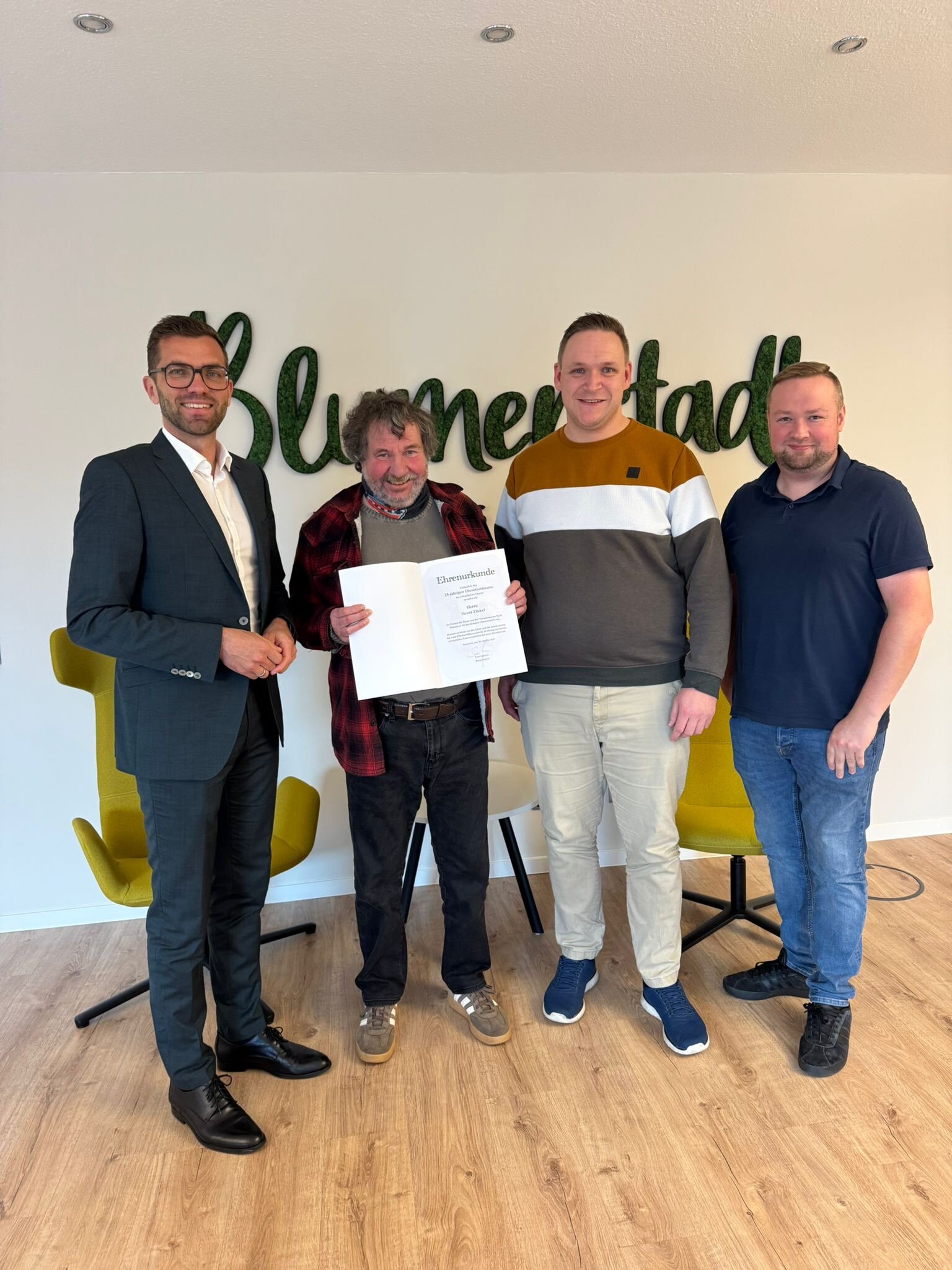 Bürgermeister Sven Lübbers überreichte dem Jubilar eine Urkunde und die Silbermünze der Stadt Wiesmoor. Zu den Gratulanten gehörten auch Onno Pollmann (Personalratsvorsitzender) sowie Daniel Becker (Fachgruppenleiter).