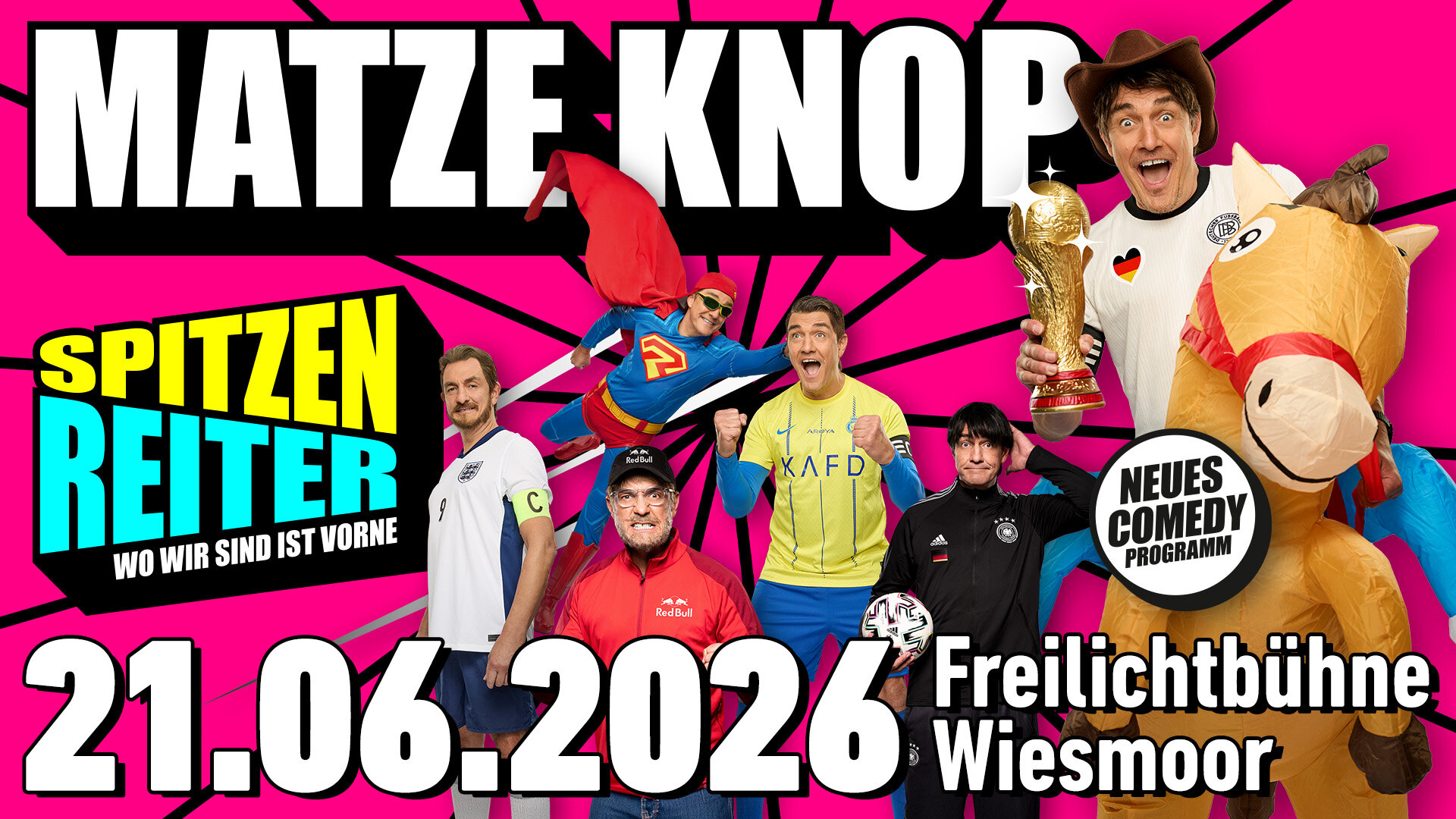 SPITZENREITER so heißt das brandneue Bühnenprogramm von Matze Knop. Zusammen mit seinem neuen Pferdebuddy reitet er wagemutig durch den Wahnsinn unseres Alltags. All den Tücken und Herausforderungen in diesen verrückten Zeiten stellt Matze sich in seiner bekannten humorvollen und ironischen Art.