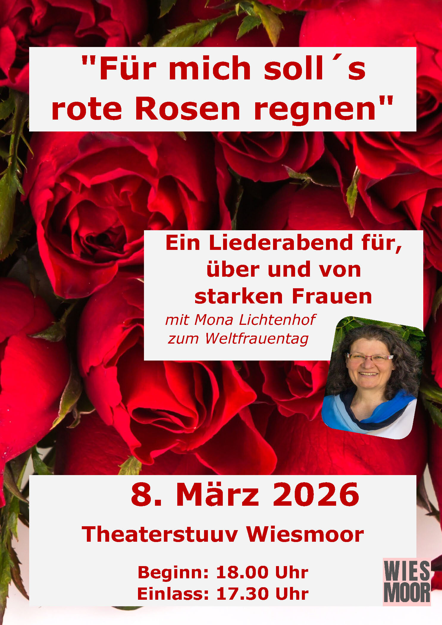 Die Gleichstellungsbeauftragte der Stadt Wiesmoor, Anja van den Boom, lädt am internationalen Weltfrauentag in die „Theaterstuuv“ ein: Freuen Sie sich auf einen Liederabend für, über und von starken Frauen. Die Künstlerin Mona Lichenhof wird mit ihrem Programm „Für mich soll’s rote Rosen regnen“ auftreten. Lassen Sie sich überraschen. Der Eintritt zu dieser Veranstaltung ist frei.